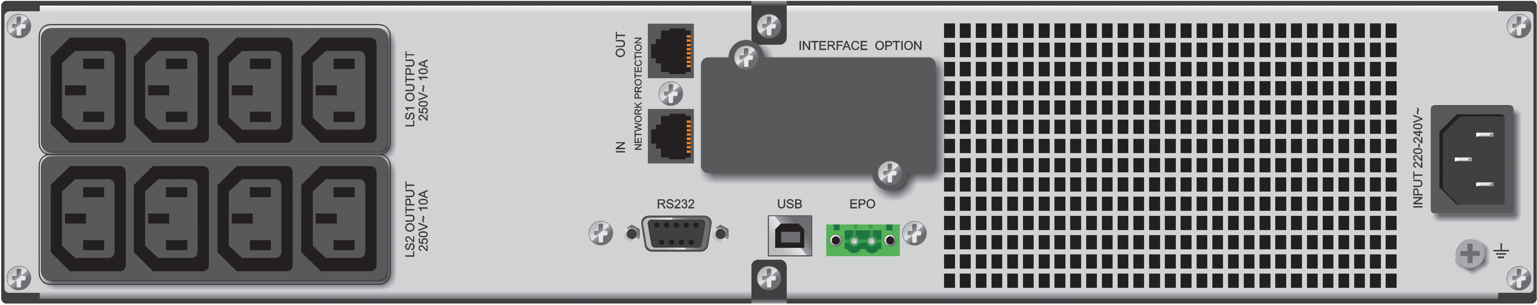 Package ContentUPS, Manual, USB Cable, Input Power Cable, RS-232 Cable, 2x IEC Cable, Tower holder, Rack Ears, EPO Plug