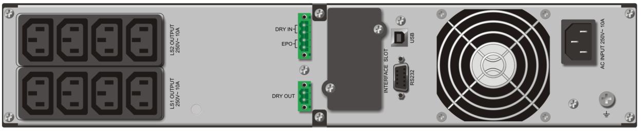 LCD IndicatorsUPS status, Load level, Battery level, Input/Output voltage, AC mode, battery mode, Bypass mode, fault conditions; LCD Display colour : Blue, red, red flashing (depends on UPS status), direction swappable (rack/tower)