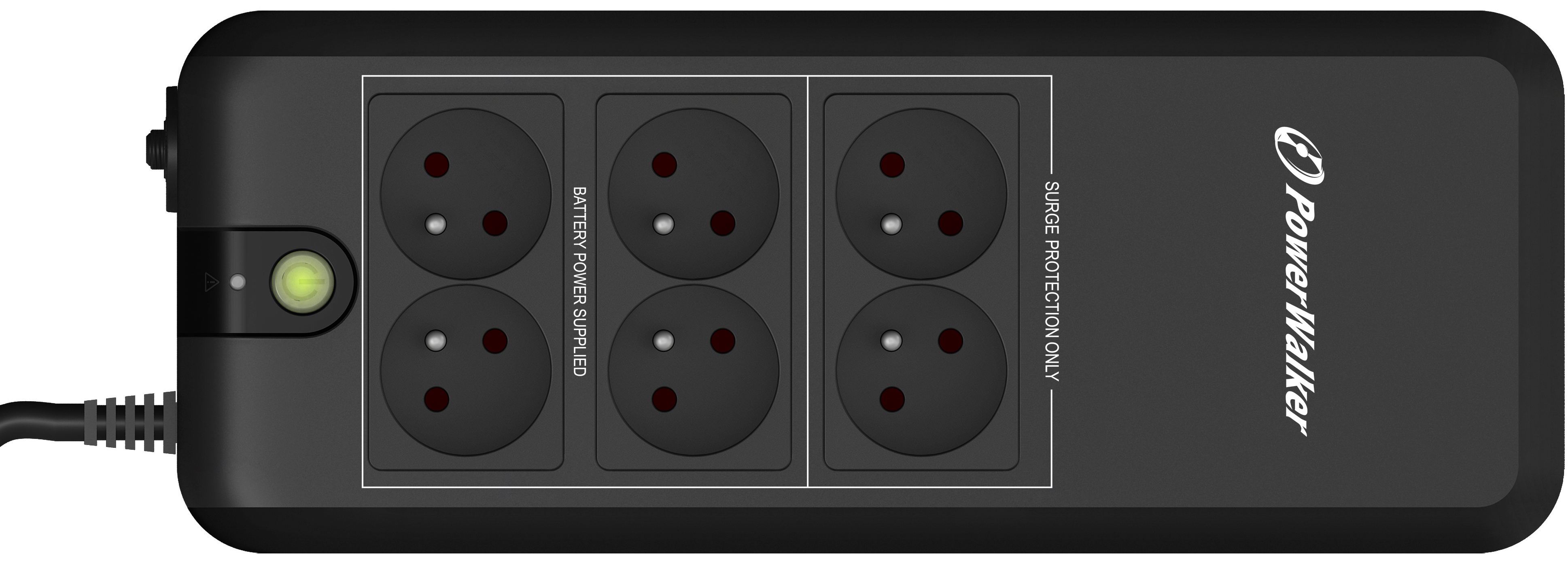 PowerWalker VFD APFC series is a standby/offline UPS for home and office applications, and it is equipped with a technology that supports the full use of the UPS’s power, even when used with a APFC device. Usually, it is required to oversize the UPS to ensure secure backup when connecting with a power load with “Active Power Factor Correction”, APFC. Therefore, you can choose a smaller cost-effective UPS. Besides the lower purchase price, it also saves energy cost due to lower own power consumption. Equipped with 6 outlets (all with surge protection, 4 with battery backup) these models can be used like a power strip. A special battery compartment enables an easy exchange of the rechargeable battery by the user.