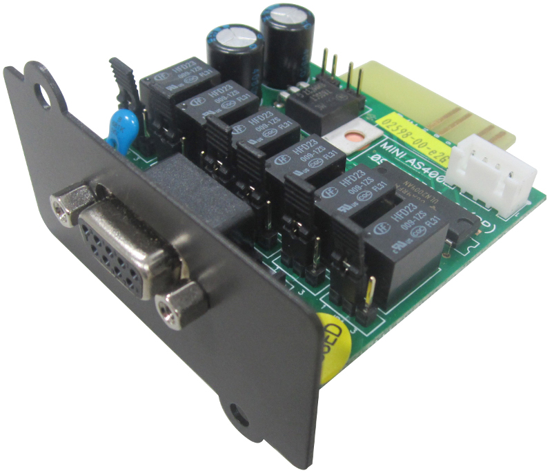 AS/400 Cards provide clean dry contacts for remote shutdown and monitoring of a UPS. It is frequently used along with PLCs and signal control panels. Information delivered are UPS failure, Alarm, Main Fail, Bypass, Battery Low, UPS On. Using AS/400 it possible to shutdown UPS remotely. Solution requires external 12V/24VDC source for a high signal.