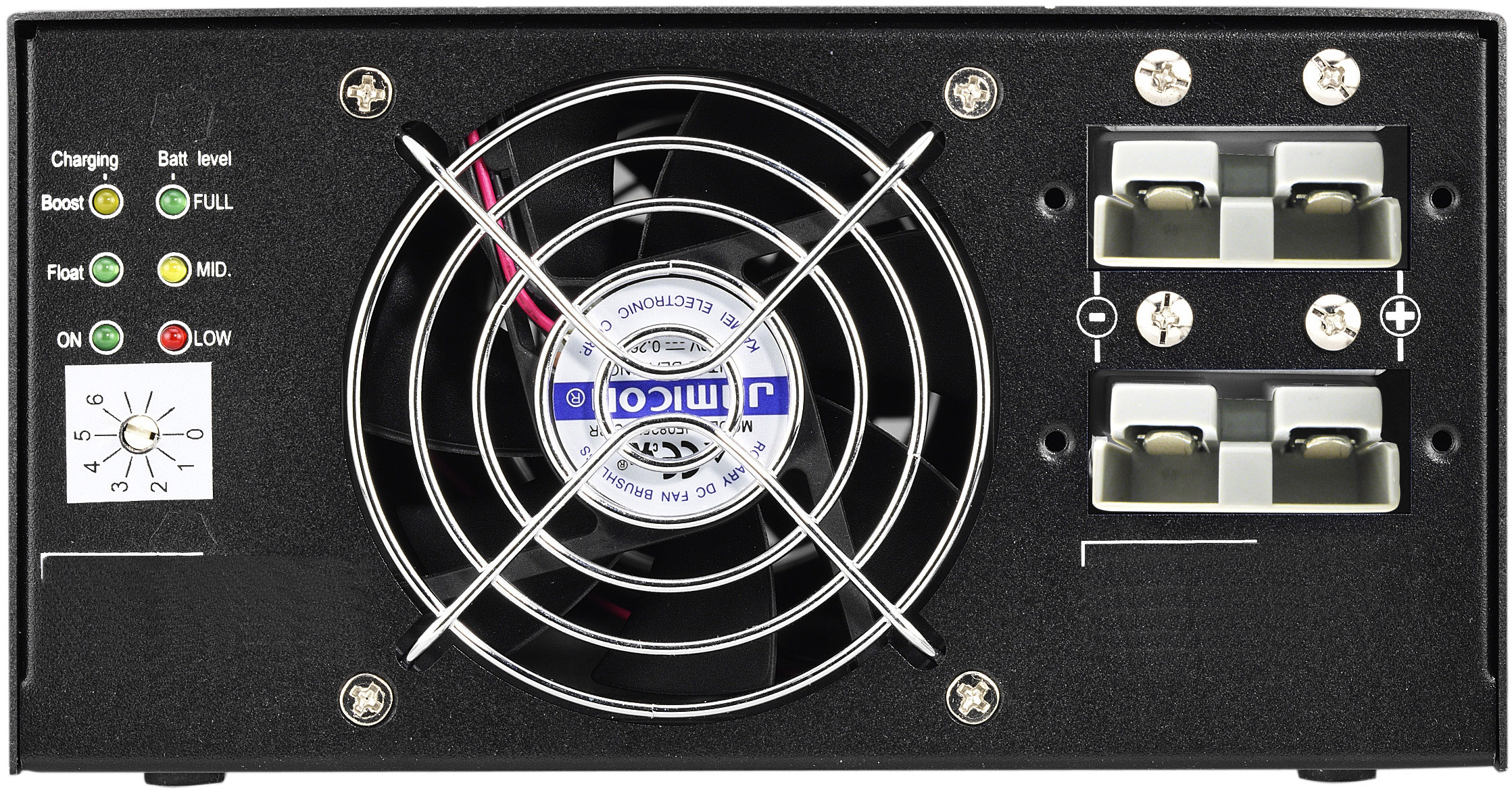 External charger in a stand-alone housing. Works parallel to the UPS. You can connect your battery pack via connector (24VDC). Charger has adjustable current up to 20A.
